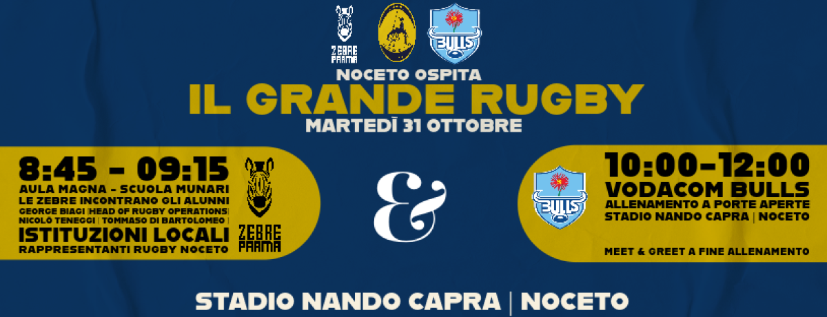 La franchigia di Pretoria, impegnata sabato 4 Novembre alle ore 14:00 allo Stadio Lanfranchi di Parma contro le Zebre, sarà infatti ospite del Rugby Noceto dalle ore 10:00 alle ore 12:00 per un allenamento a porte aperte sul manto erboso dello Stadio Nando Capra. A far da cornice e a dare il benvenuto ai Bulls ci saranno circa 200 studenti della Scuola Munari che prima incontreranno una delegazione delle Zebre Parma in aula magna.